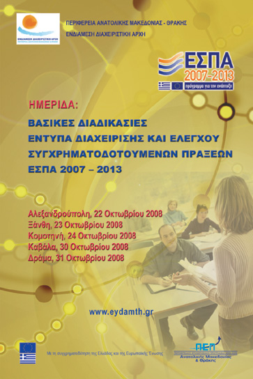 Στο πλαίσιο της προσπάθειας για την όσο το δυνατόν πιο έγκαιρη ενημέρωση και υποστήριξη του έργου των Δυνητικών Δικαιούχων (της Περιφέρειας Ανατολικής Μακεδονίας – Θράκης), η Ενδιάμεση Διαχειριστική Αρχή Περιφέρειας Α.Μ.Θ., διοργανώνει ενημερωτικές Ημερίδες με θέμα: