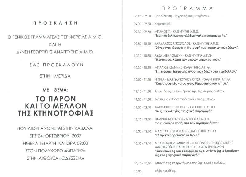 Ο Γενικός Γραμματέας της Περιφέρειας Ανατολικής Μακεδονίας και Θράκης κ. Δημήτριος Σταμάτης και η Διεύθυνση Γεωργικής Ανάπτυξης Α.Μ.Θ. σας προσκαλούν στην Ημερίδα: Το παρόν και το μέλλον της Κτηνοτροφίας που θα πραγματοποιηθεί την Τετάρτη 24 Οκτωβρίου 2007 και ώρα 9.00πμ στην αίθουσα "Οδύσσεια" του Πολυχώρου "Μπάτης" στην Καβάλα.